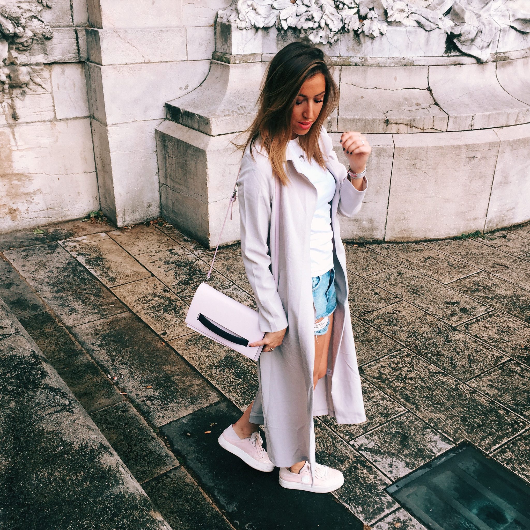 J’ai reçu ce week-end cette veste longue grise que j’avais commandée chez Missguided. Aussi tôt reçue aussi tôt portée ! L’après midi même je rejoignais Caroline pour une session shooting/shopping et restaurant. J’adore le mouvement des vestes longues lorsque l’on marche, elles rendent élégantes les tenues les plus basiques. On ne peut pas faire plus simple, je porte mon t-shirt Petit Bateau : je suis tout simplement folle de leur gamme de t-shirt coton col rond, parfaitement coupé, moulant comme il faut, je l’ai d’ailleurs en plusieurs couleurs. Je porte un short ZARA, et surtout mes nouvelles petites baskets de chez Pataugas, ce modèle est incroyable avec une petite plateforme elle sont rose poudré légèrement vernies. Depuis que je les ai je les porte quasiment tous les jours.