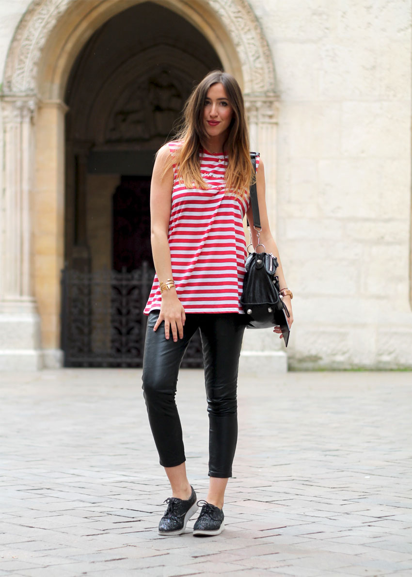 Sinon pour en revenir à mon look, je porte un t-shirt marinière rouge, que j’ai acheté à Primark Barcelone (d’ailleurs j’ai pas craqué que pour ça), il est large et long comme j’aime avec une coupe rock, je l’ai associé avec mon pantalon en cuir ATHE (par Vanessa Bruno) que j’aime sortir en hiver mais aussi en mi-saison comme là. Pour finir, mes chaussures sont des TopShop à paillettes pour le côté girly et mon sac Balenciaga parce que je n’arrive plus à le quitter (dites le si vous en avez déjà marre de le voir ><).